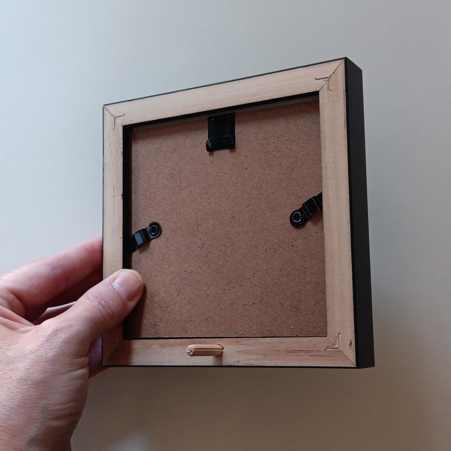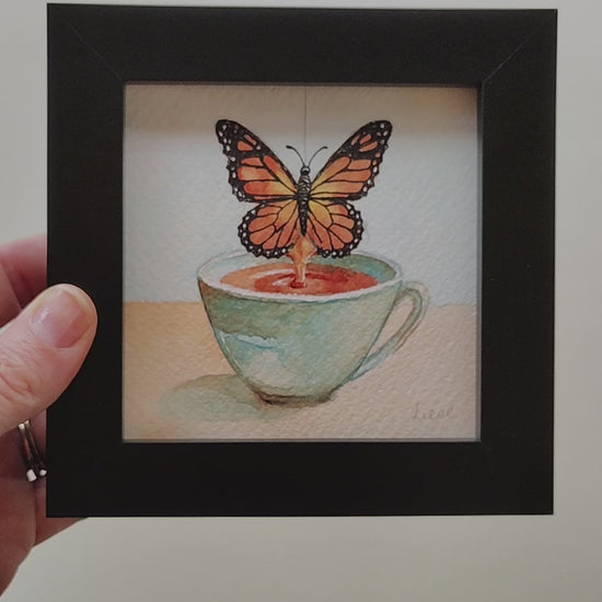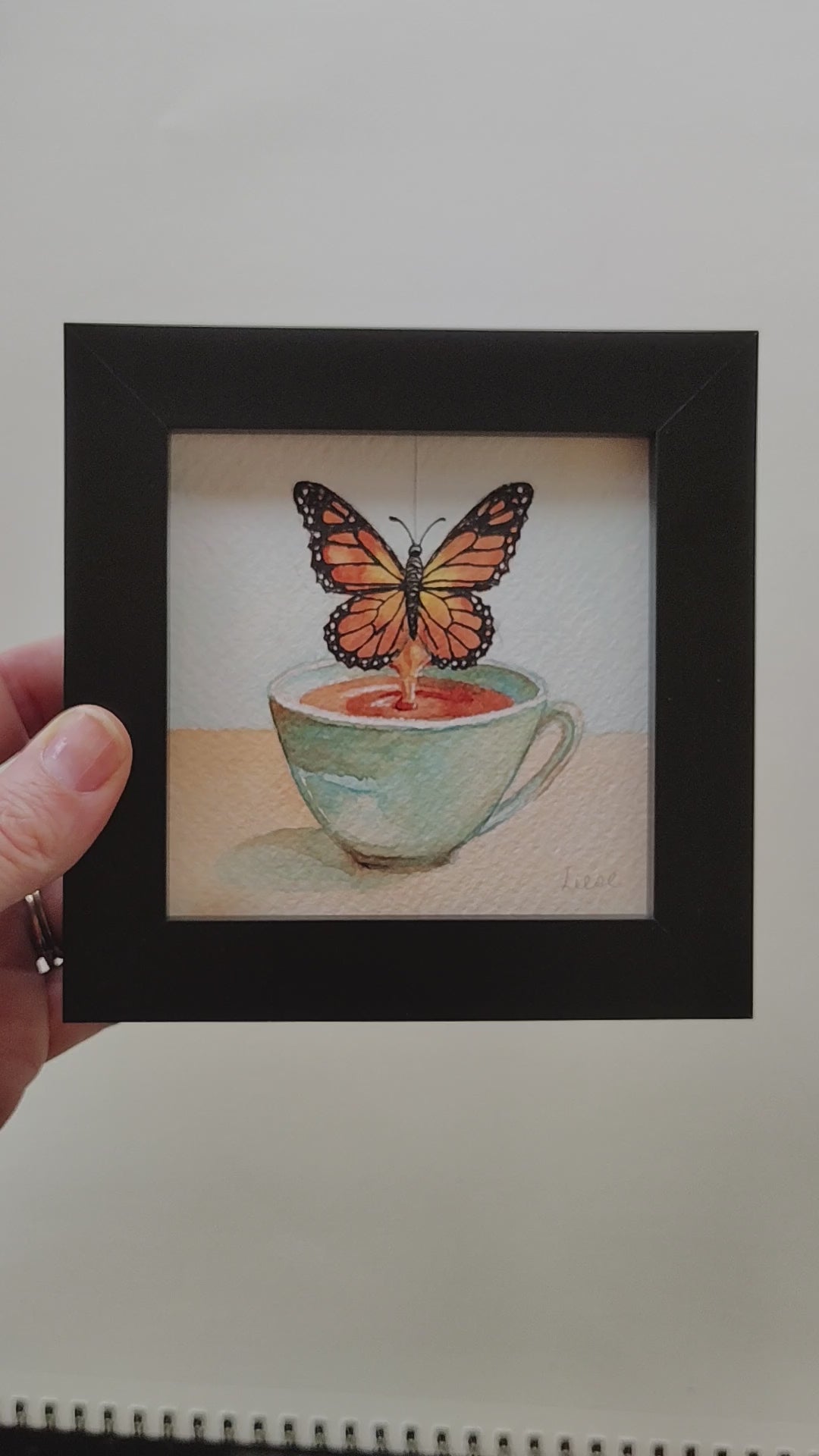 Framed Ink and Watercolor on Paper. The painting is about 4x4 inches, the Frame is 5x5 inches. This frame is ready to hang on the wall or sit happily on a shelf.