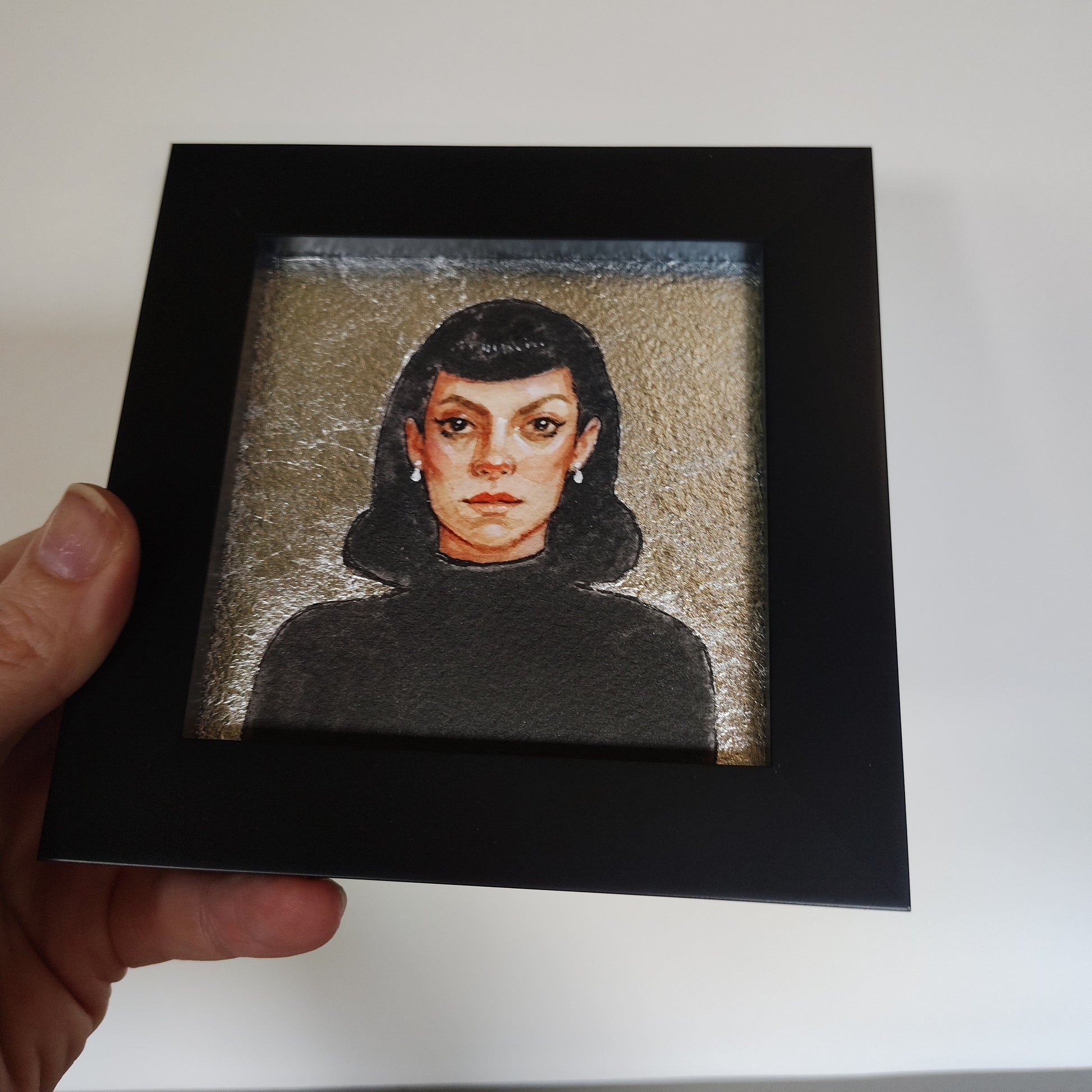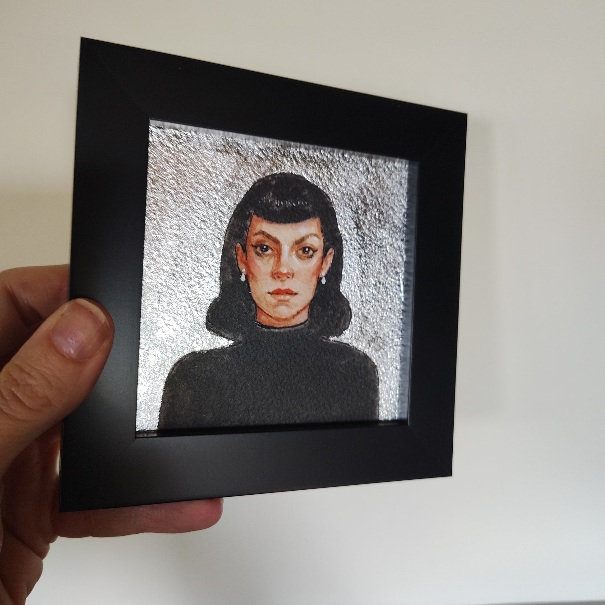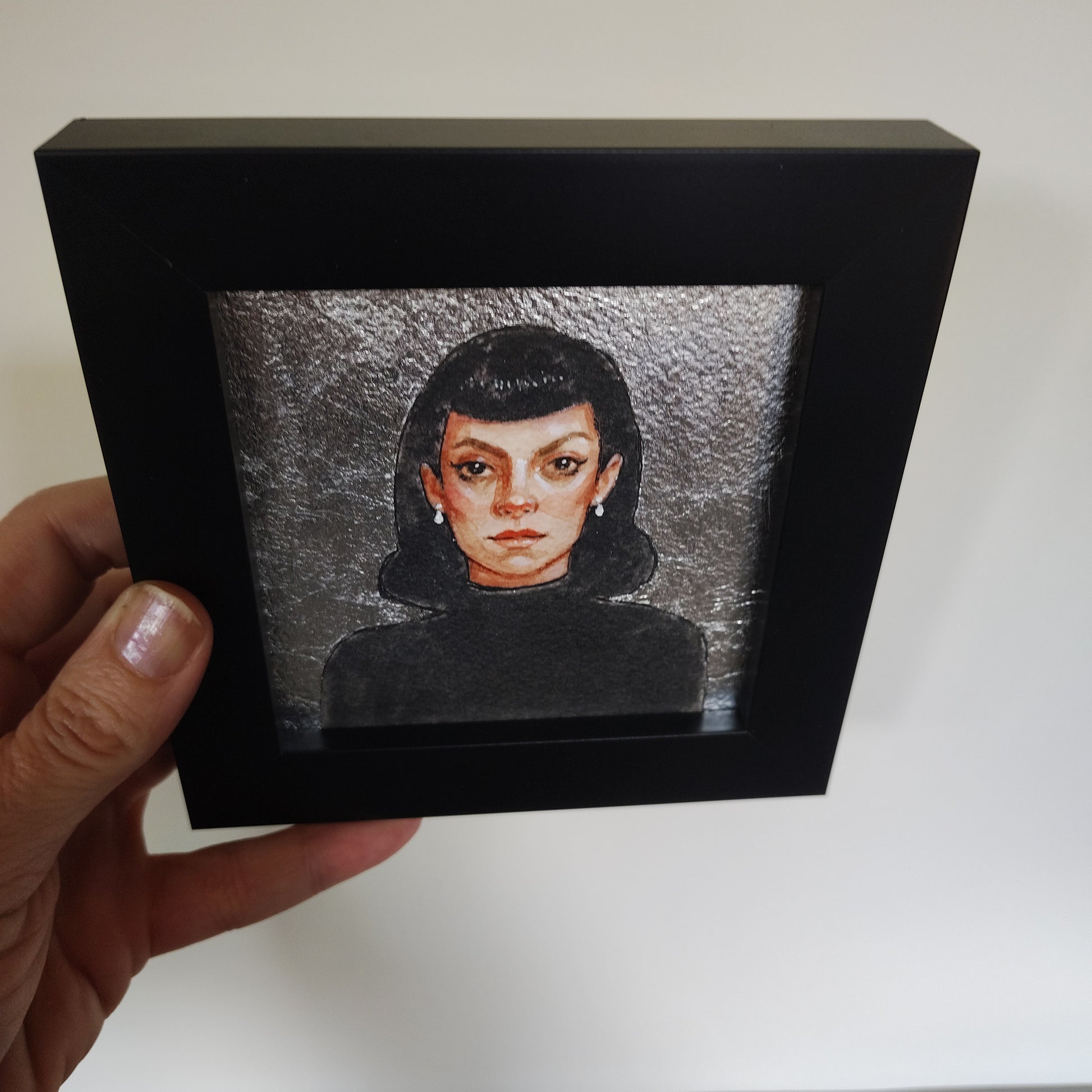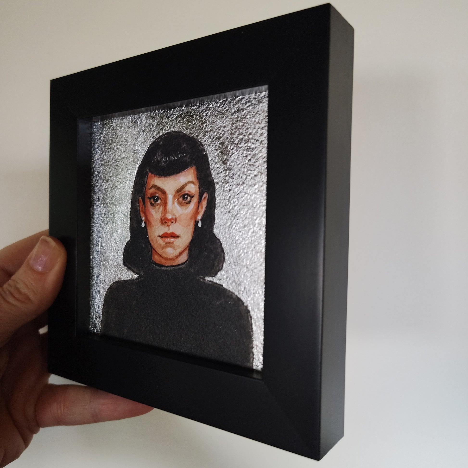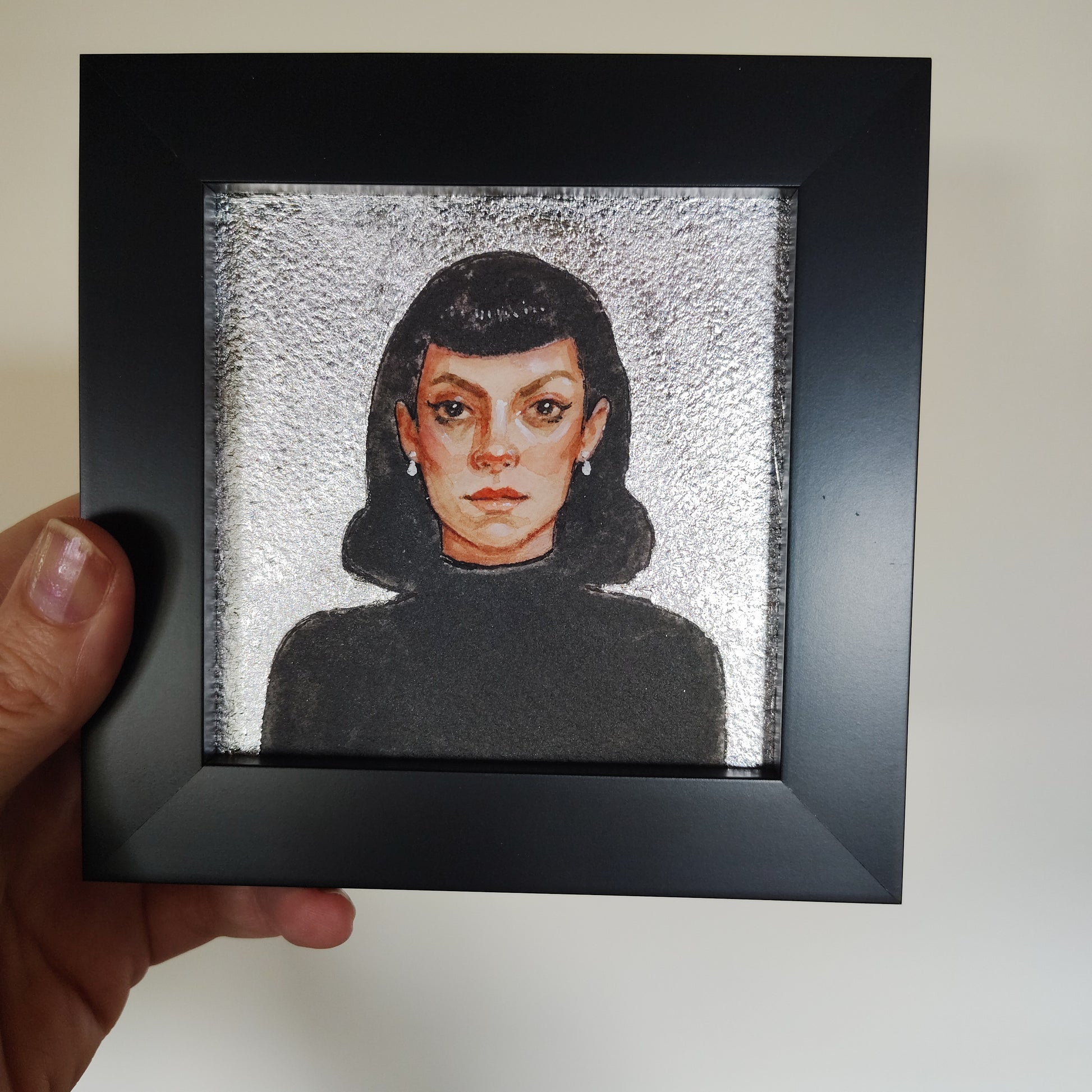 This original Framed artwork is painted on smooth, heavy 300gsm paper, and measures 4x4 inches, framed to 5x5 inches. I have used aluminum leafing, ink and watercolor. This frame is ready to hang on the wall or sit happily on a shelf.