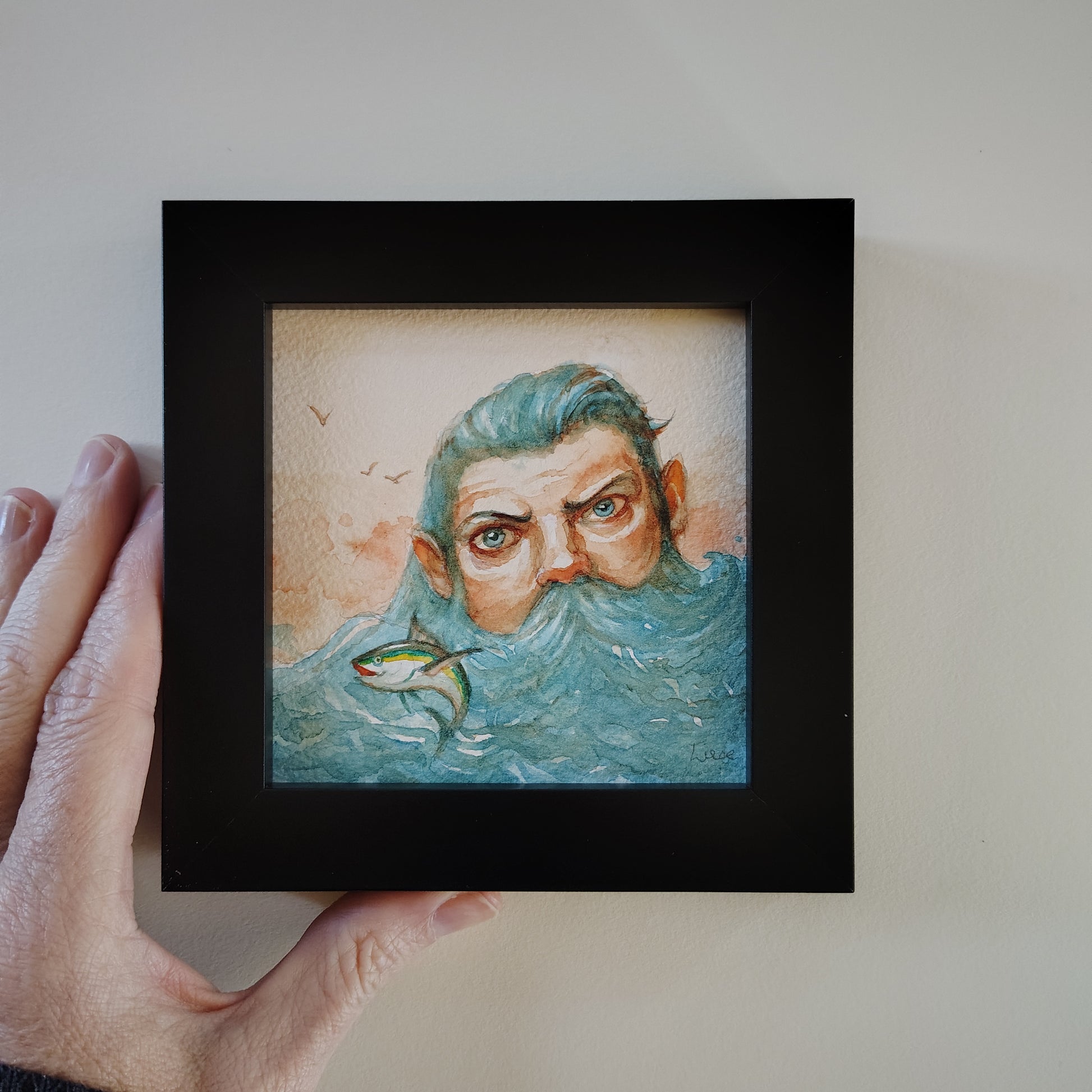 Framed Ink and Watercolor on Paper. The painting is about 4x4 inches, the Frame is 5x5 inches. This frame is ready to hang on the wall or sit happily on a shelf.